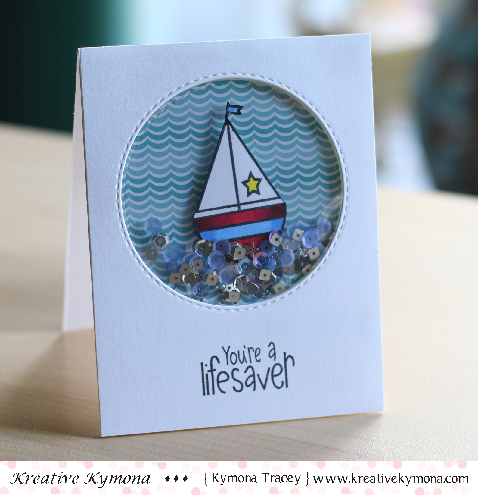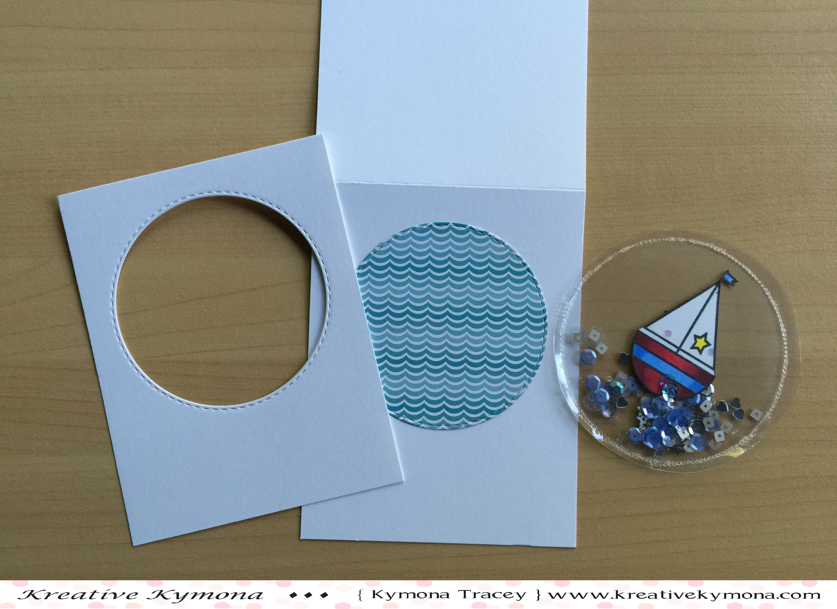 When I saw the sailboat, I knew I need to make a shaker card.  I also knew I wanted the boat to be in the shaker pocket with the sequin, riding the waves!!  LOL!
