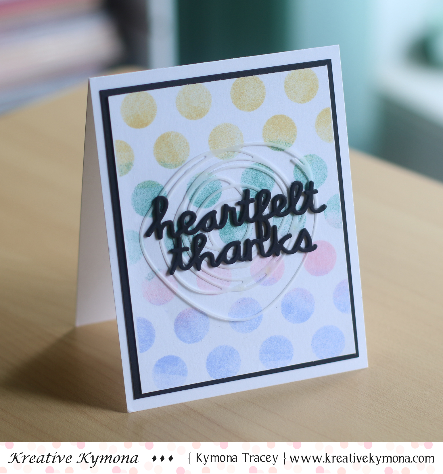 I used Papertrey Ink’s Circle Scribbles Die to cut a piece of vellum.  Then I die cut Paper Smooches Heartfelt Thanks sentiment out of black card stock.  I attached both to the card front using Tombow Multipurpose Glue.
