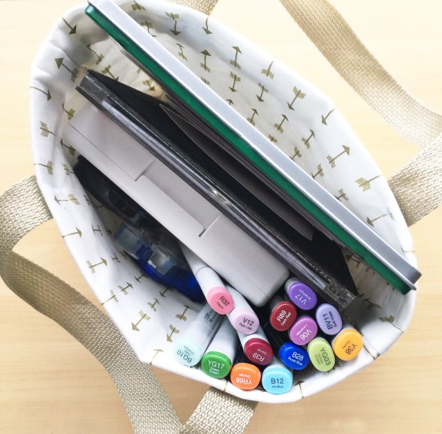 It holds my Copics, Tombow Recycle Color Pencils, MISTI, Tombow Adhesive, Clearsnap Colorbox Ink Pad, and cardstock.
