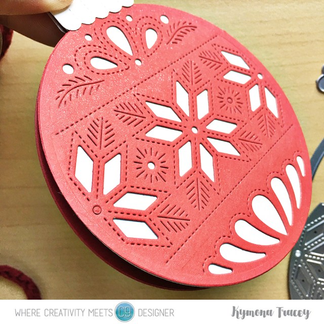 For this tag, I used Concord & 9th Ornamental Dies. I die cut three red pieces and one white piece.  I used the additional die pieces to emboss the front of one of the red pieces.