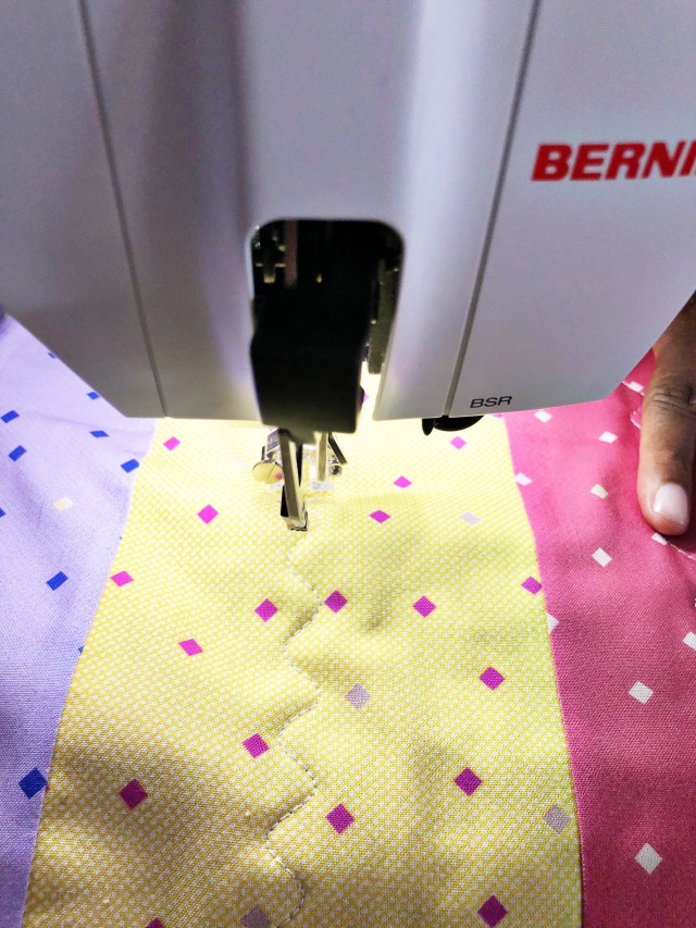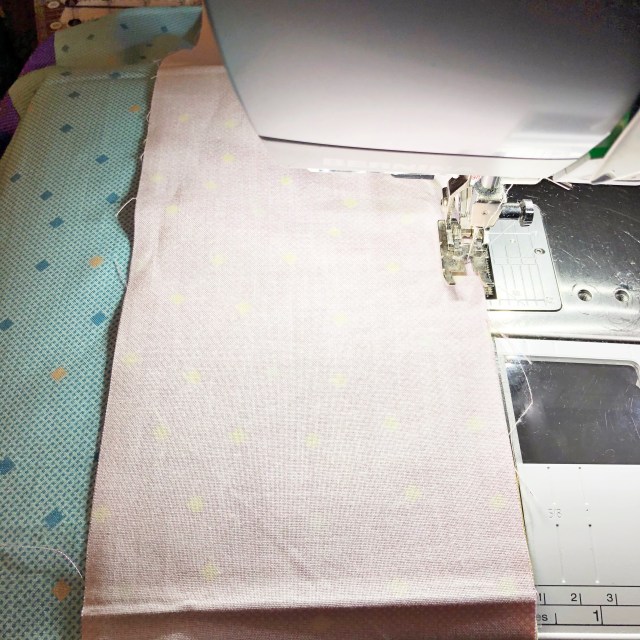 Sew down the side, stretching out the fabric. Backstitching over the elastic ends.