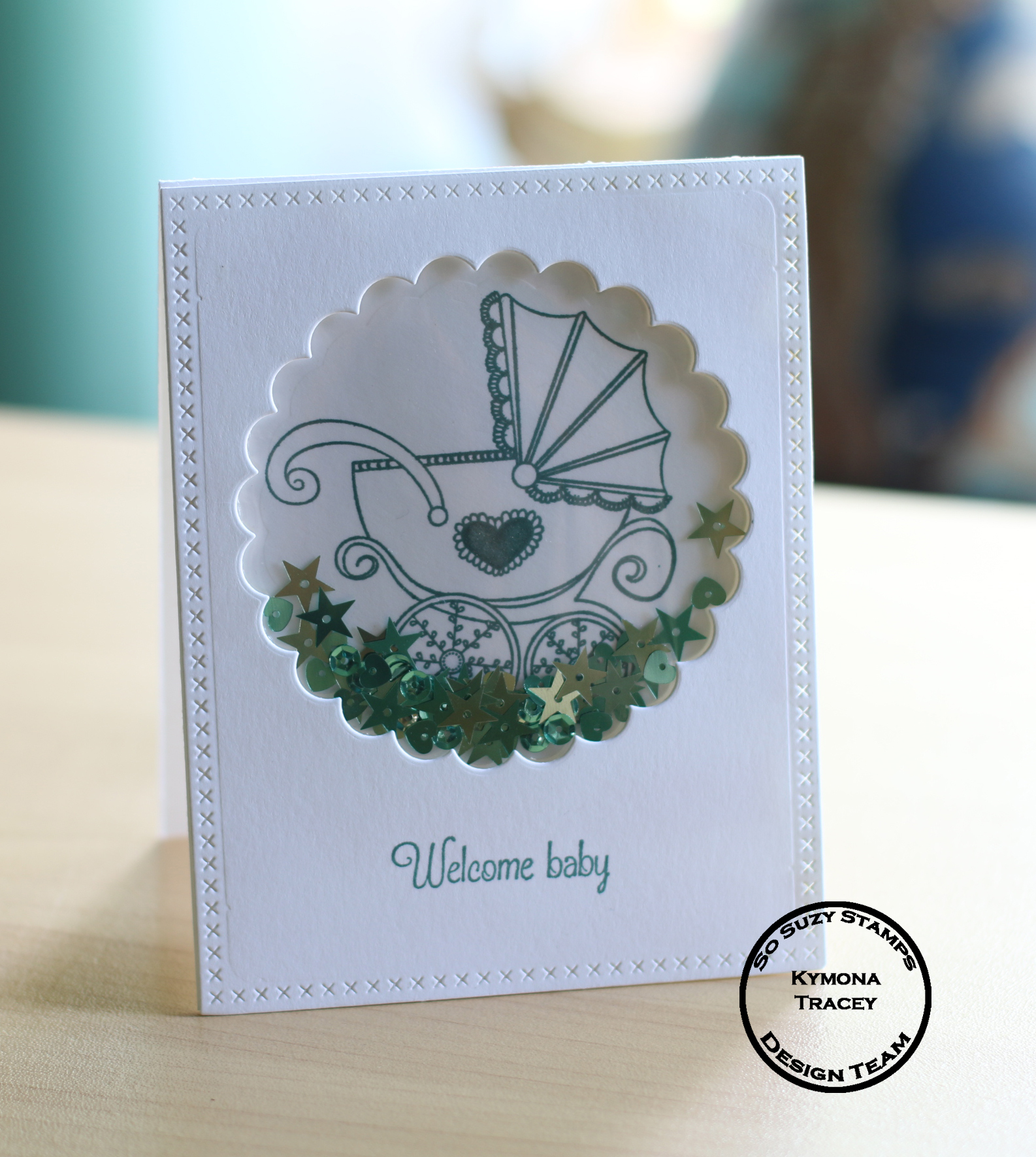3. I stamped So Suzy Stamp Pretty Baby Carriage in the center of the shaker window using Stampin’ Up! Lost Lagoon Ink.