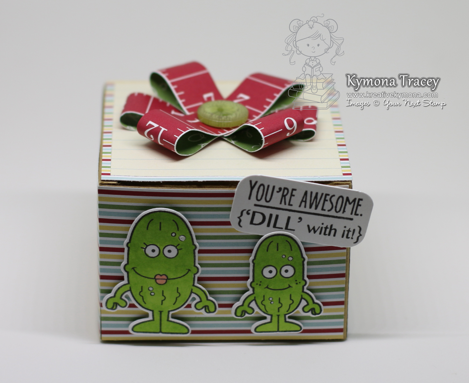 Then I color the pickles using my Copic Markers: YG23, YG25, R20.  I die cut them out and adhered them to the box.