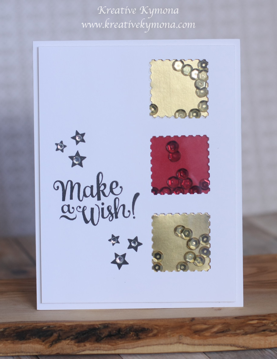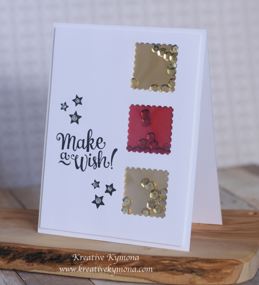 For this card, I used Mama Elephant’s Make a Wish stamp set to create my birthday card. I used Stampin’ Up! postage punch to create my shaker card. I decided to use gold and red because these colors are perfect for an elegant birthday party.