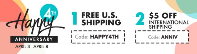 FREE U.S. shipping with code HAPPY4TH or $5 OFF international shipping with code ANNIV at checkout. Offer valid from April 3rd until April 8th at 11:59 pm EDT. Not valid on prior purchases. Cannot be combined with other promo codes.