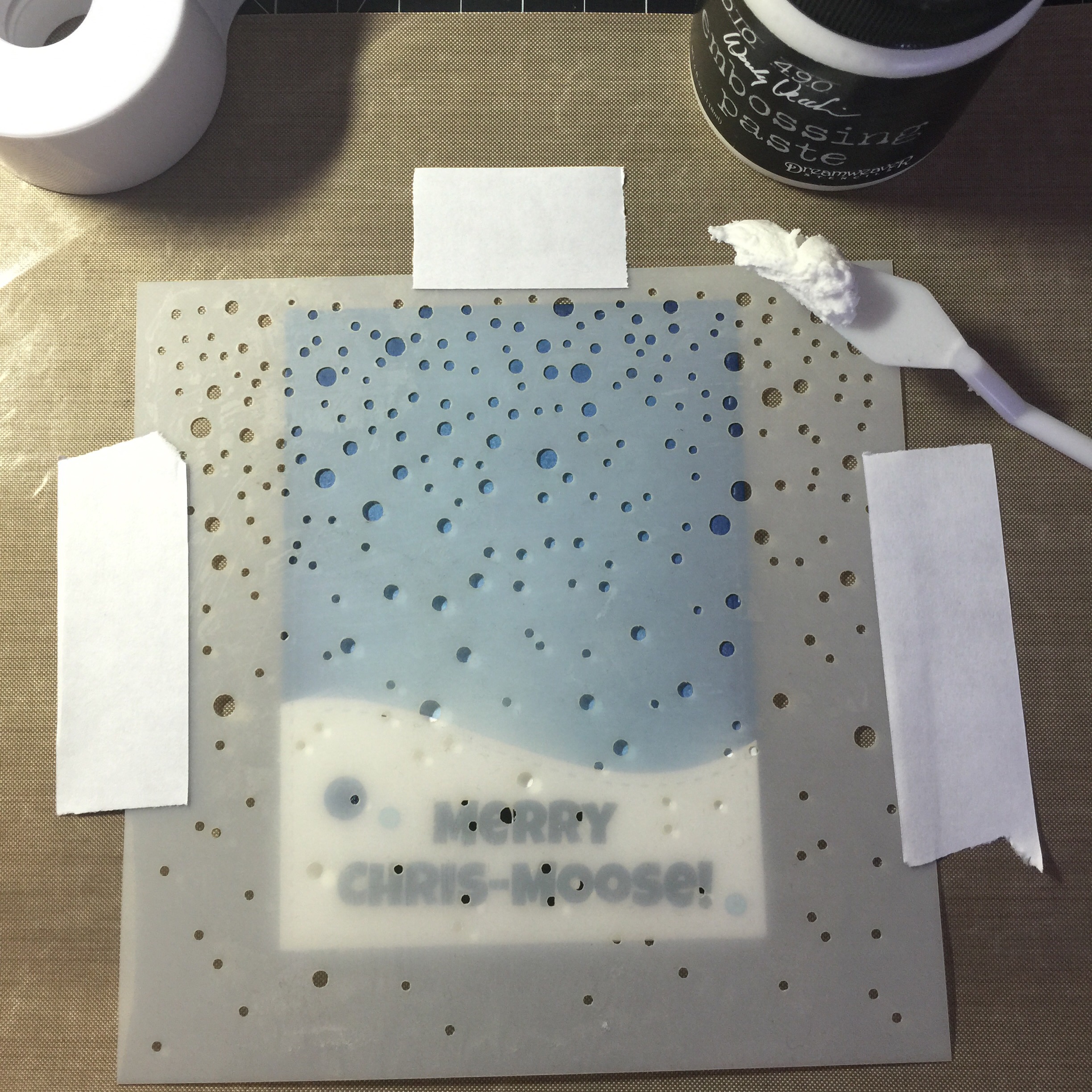 It’s quite easy, all I did was place my stencil on top of my card panel with tape. Then I used a palette knife and scooped up some of that embossing paste. I spread the paste over the stencil where I wanted the snow to appear.
